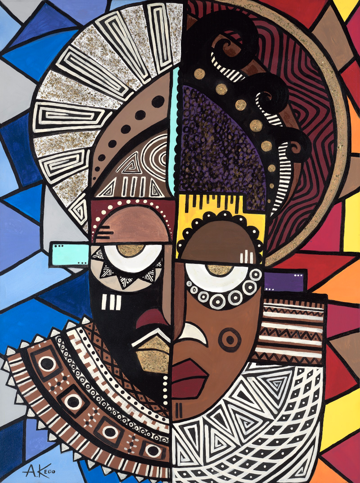His/Hers explores the divine balance of masculine and feminine energy within us all. The dual-faced composition symbolizes unity, equality, and the harmony between strength and tenderness. Inspired by African geometric symbolism and stained-glass aesthetics, each bold shape and color reflects the multifaceted nature of identity and connection. Gold accents represent spiritual illumination and ancestral presence, while the textured hair and cowrie motifs celebrate cultural heritage. This piece invites viewers to embrace both sides of themselves, the protector and the nurturer as essential forces in creation, love, and self-discovery.