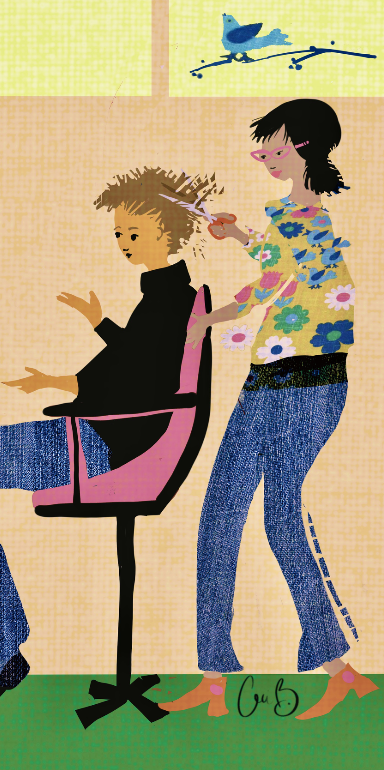 A Haircut was inspired by Maru, the hair salon next to my studio in North Berkeley. I often see people leaving after a cut with a renewed sense of self and quiet confidence. Built with layered digital collage and vintage textiles, the piece celebrates hairstyling as its own form of art making — an everyday act of creativity, care, and transformation.