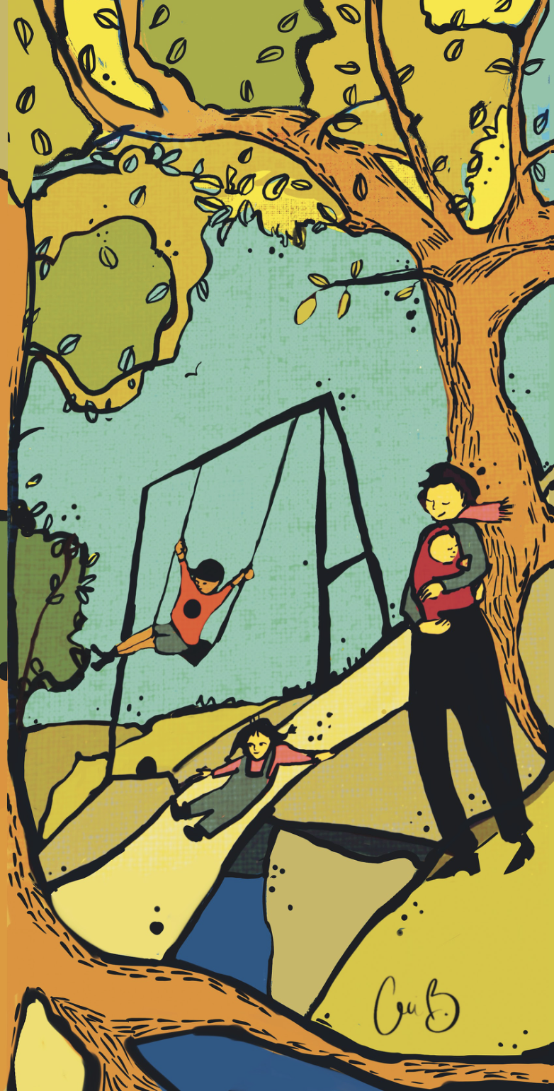 In the Park captures a moment at Codornices Park in North Berkeley, where a mother stands beneath the oak trees watching her children play. Layers of digital collage and linen textures in soft greens and golds evoke the light and movement of an afternoon outdoors.