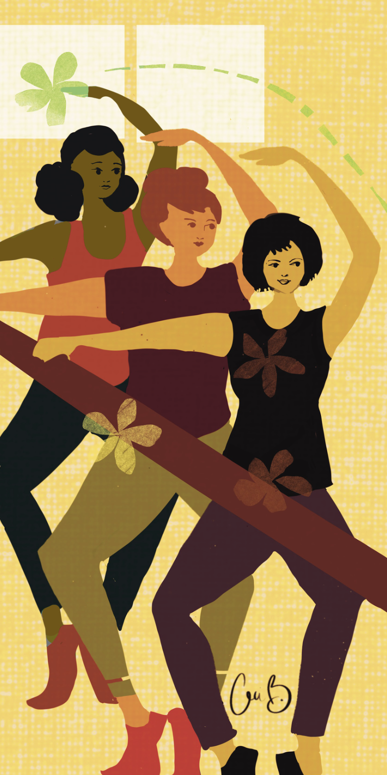 Move Together shows women sharing space — each focused, yet connected through shared focus on exercise. Inspired by my own experience at the North Berkeley Bar Method, the piece uses layered digital collage and linen textures in a neutral palette that reflects the calming spirit of moving together.