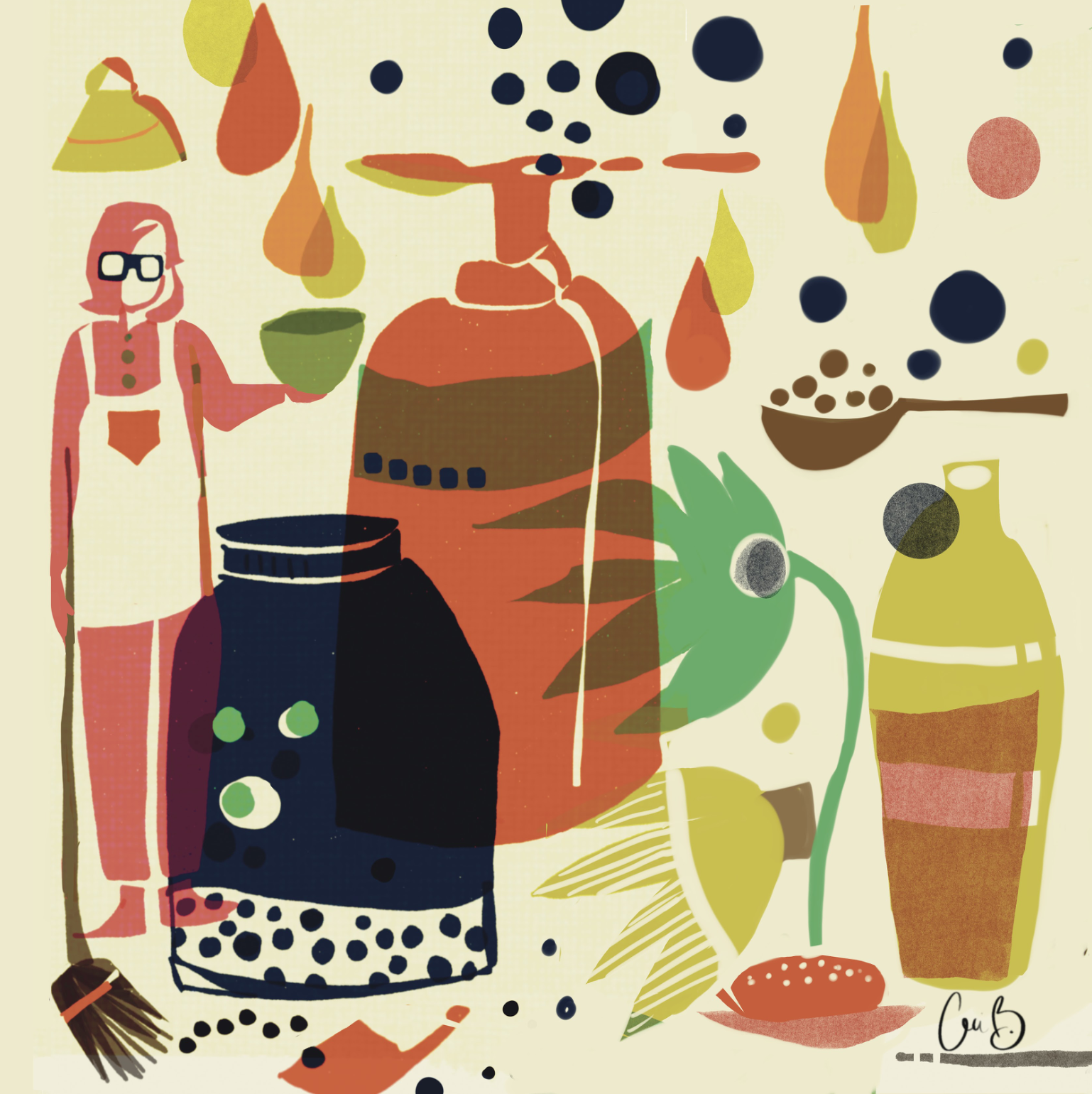 The Filling Station is inspired by a North Berkeley refill shop known for its thoughtful design, friendly service, and simple message — use less, waste less. The piece highlights everyday objects like jars and bottles, layered in color and texture to reflect the calm and care found in the store itself.