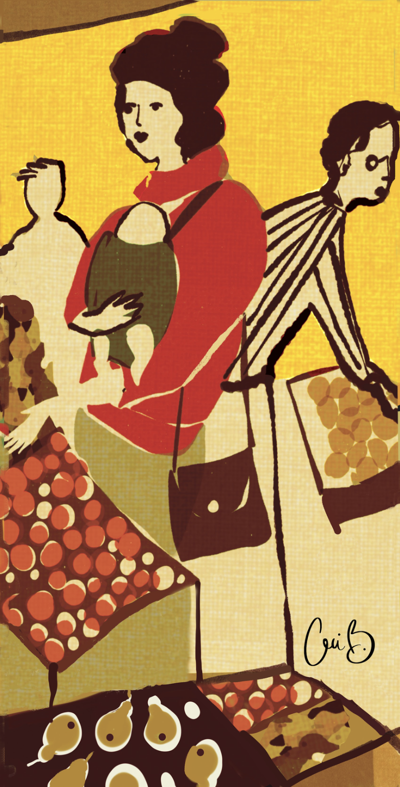 Farmers Market shows a mother and baby at the North Berkeley farmers market on a golden autumn day. The image was built up in layers of digital collage using linen textures and warm fall colors to reflect the everyday fabric of local life.