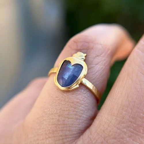 18k yellow gold tanzanite beetle with hammered shank ring, matte finish, one of a king.