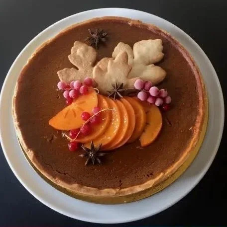 A deep creamy pumpkin pie, nicely spiced, with a touch of rum, in a short dough crust.