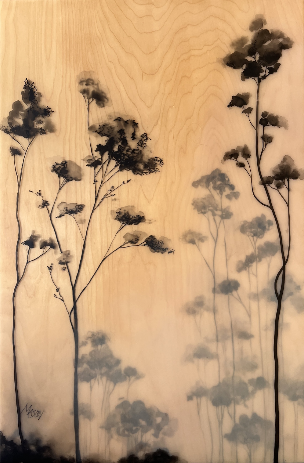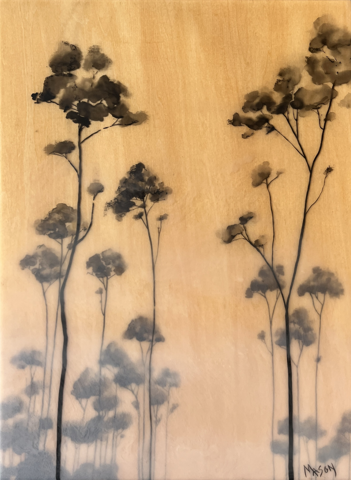 2 Pieces: Whispering Woods is part of my Whisper Series and is a three-panel painting created in sumi ink, oil and resin. The piece feels delicate yet holds its own, creating a remembered space that allows one to recall such quiet moments and cherished memories. Honoring the quiet meditation found in the fog layers of the morning-start, one longs to stretch and inhale the surroundings of yet another incredible day. My Whisper painting series draws viewers in – to first experience the drama from across the room, and upon approach are delighted with detail of the fog-laden treescapes.