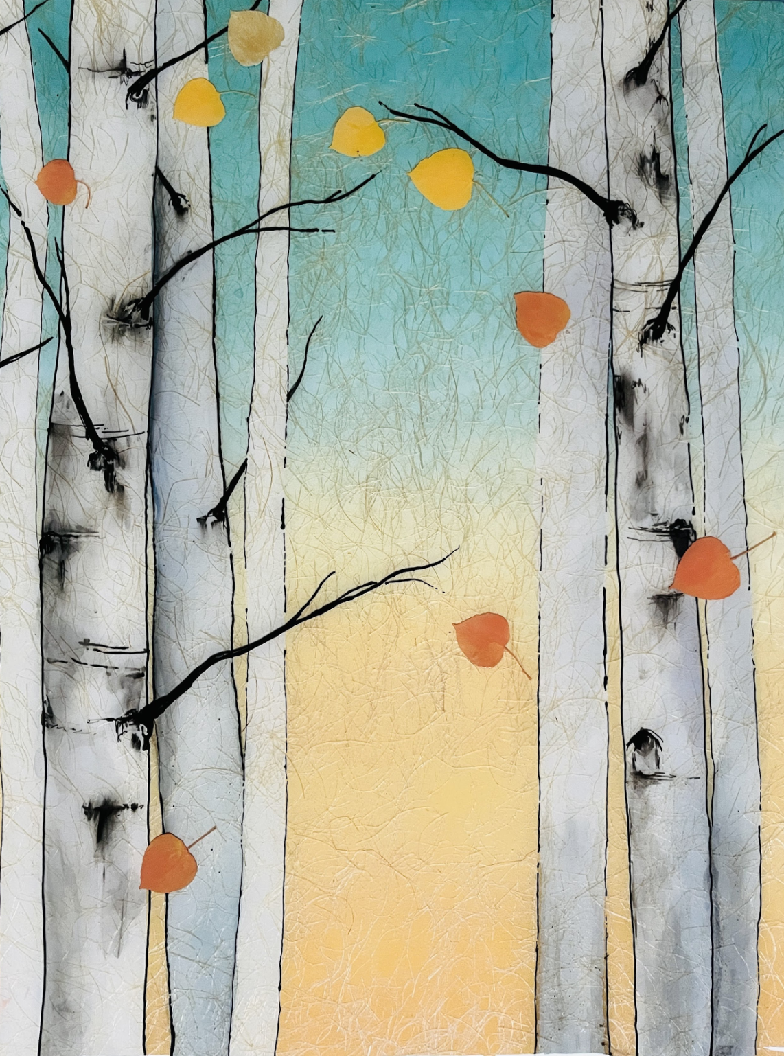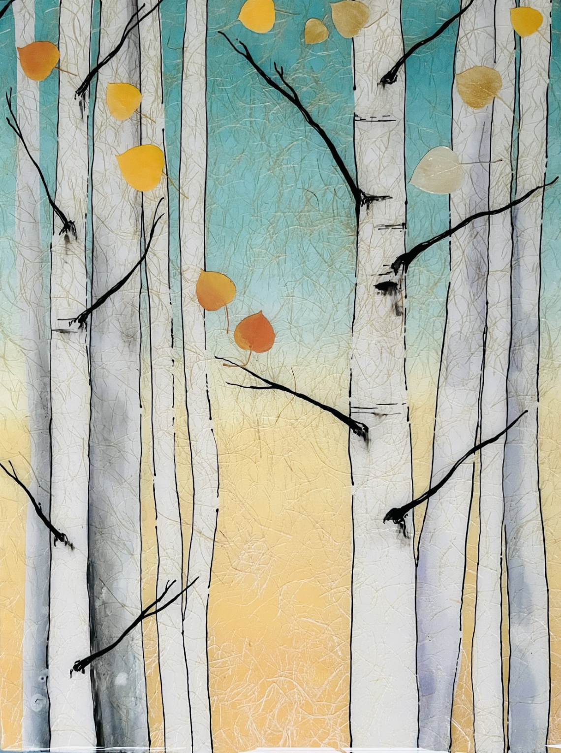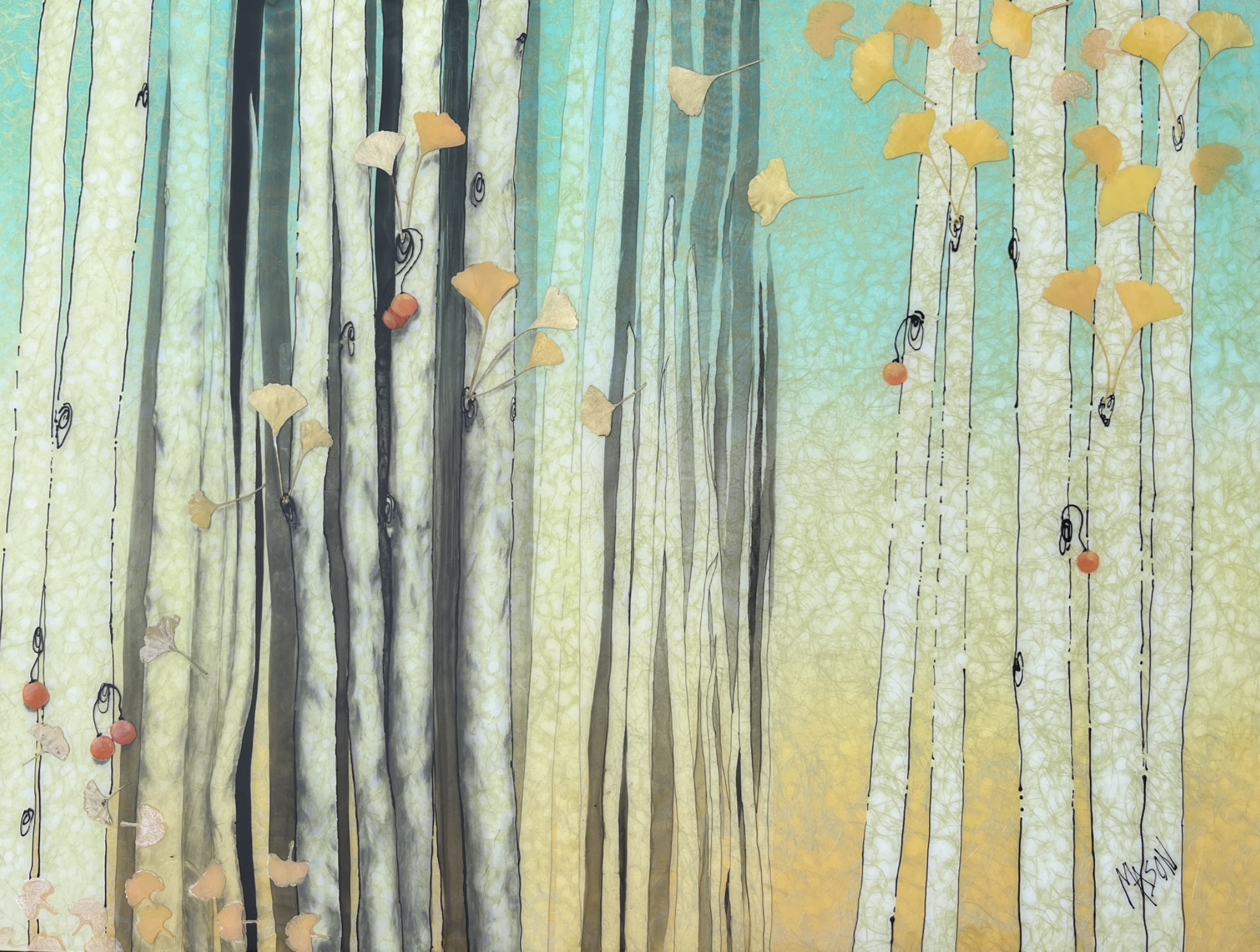 Gingko Playground is part of my Warm Breeze series and is inspired by the stark drama of woodblock prints. Here sun-drenched trees set the mood and are inspirational focal points, capturing the simplicity of Japanese paintings. In my Warm Breeze series, scenes come to life with leaves of gingko bouncing across multiple panels. To create this effect, real leaves are collected from around the neighborhood, dried and embedded into the resin of the painting, providing a three-dimensional effect.