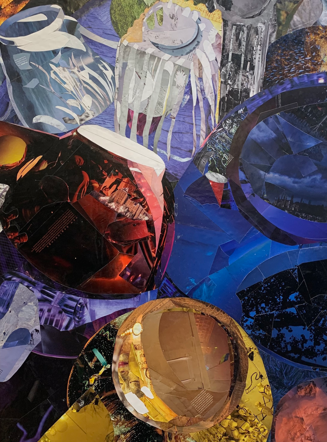 Dishes, bowls, and cups turned upside down to dry by my sink remind me of human relationships; some dishes lean on each other, some bowls are stacked, some cups are more isolated than others. This piece features a red mid-century coffee cup on the center left and a blue glass bowl on the center right.